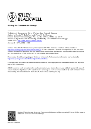 The winter run of Chinook salmon (Oncorhynchus tshawytscha) on the Sacramento River in California (U.S.A.) was the first Pacific salmon stock to be listed under the U.S. Endangered Species Act. We describe some of the characteristics of Pacific salmon populations that require special consideration in viability analysis during development of a model specific to the Sacramento River winter run of...