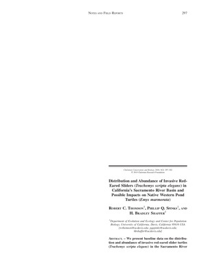 We present baseline data on the distribution and abundance of invasive red-eared slider turtles (Trachemys scripta elegans) in the Sacramento River basin of northern California and discuss their possible impacts on the native western pond turtle, Emys [= Actinemys] marmorata. Although T. s. elegans may be able to spread throughout the drainage, our surveys suggest that it is currently concentrated...