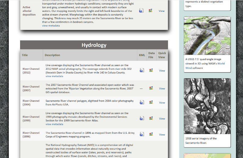 The Sacramento River Geospatial Data Library is a resource for finding spatial data for the Sacramento River. The Sacramento River Geographic Information System is intended to help with locally based decision-making, assisting in understanding and analyzing land use and vegetation patterns, flooding, erosion, and channel dynamics on the river.
